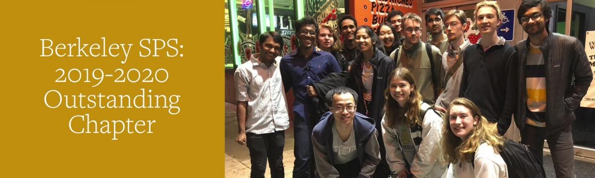 The SPS National Council has reviewed all chapter reports and has awarded the University of California-Berkeley Society of Physics Students as a 2019-2020 Outstanding Chapter. This is the highest level of distinction given to SPS chapters and is received by less than 10% of top chapters annually. The award commends the Berkeley SPS chapter's dedication and commitment to the SPS mission and vision in helping to foster a strong SPS community. This is the third year in a row that the Berkeley SPS chapter has been awarded this honor.